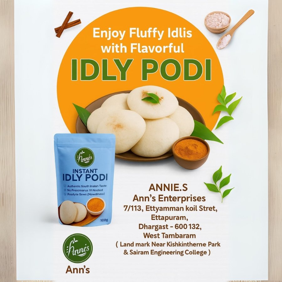 Annes presents Idli Dosai Podi, a traditional South Indian spice blend that transforms your everyday idli and dosa into a flavorful delight. Made from premium roasted lentils, red chilies, and aromatic spices, this chutney powder offers the perfect balance of taste and texture. Simply mix it with sesame oil or ghee for a delicious side dish that enhances your breakfast experience. Free from preservatives and artificial flavors, Annes Idli Dosai Podi brings you the authentic homemade taste of Tamil Nadu in every bite. Enjoy the rich aroma, crisp texture, and wholesome nutrition that make every meal memorable.